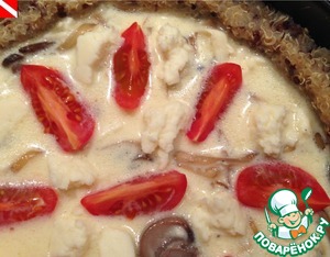 Переливаем начинку в подготовленную форму, сверху раскладываем дольки помидоров черри