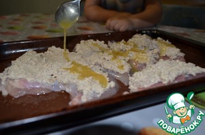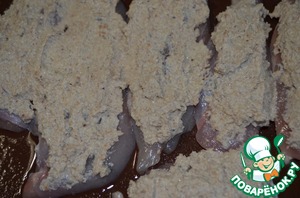 Кусочки куриного филе выложить рядком в огнеупорную, смазанную маслом форму, и покрыть пастой