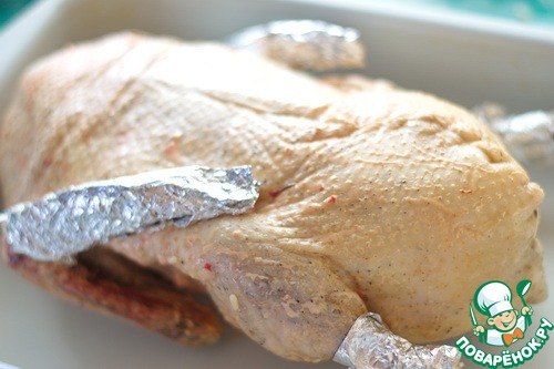 Отверстие зашейте. Крылышки и ножки я обернула фольгой, чтобы не сгорели.