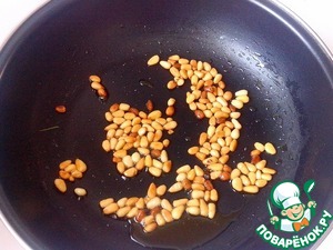 Оливковое масло ( 1 ст. л.)налить в сковороду и нагреть на среднем огне. Обжарить кедровые орешки 1-2 минуты, до золотисто-коричневого цвета, периодически помешивать. Переложить на тарелку.