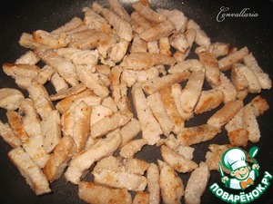 В сковороде разогреть растительное масло и быстро обжарить мясо до появления золотистой корочки. -