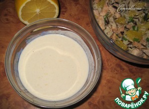 Для заправки взбить йогурт с горчицей, добавить мускатный орех, лимонный сок 1/2 ч. л. апельсиновой цедры.