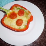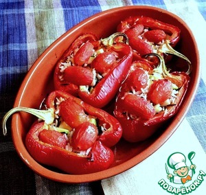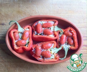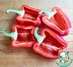 Перцы лучше использовать мясистые красные. На мой взгляд, они сочнее и слаще. Их необходимо вымыть, разрезать напополам, сохраняя плодоножки. Семена удалить. Сложить в смазанную маслом форму, присолить и поперчить. Запекать 15-20 минут при 180 градусах.