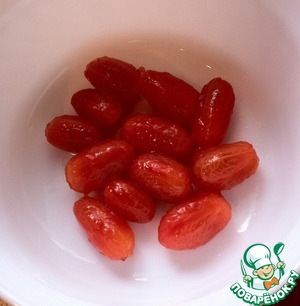 Помидорки черри (я взяла сливовидные) обливаем сначала кипятком, затем холодной водой и снимаем кожицу.