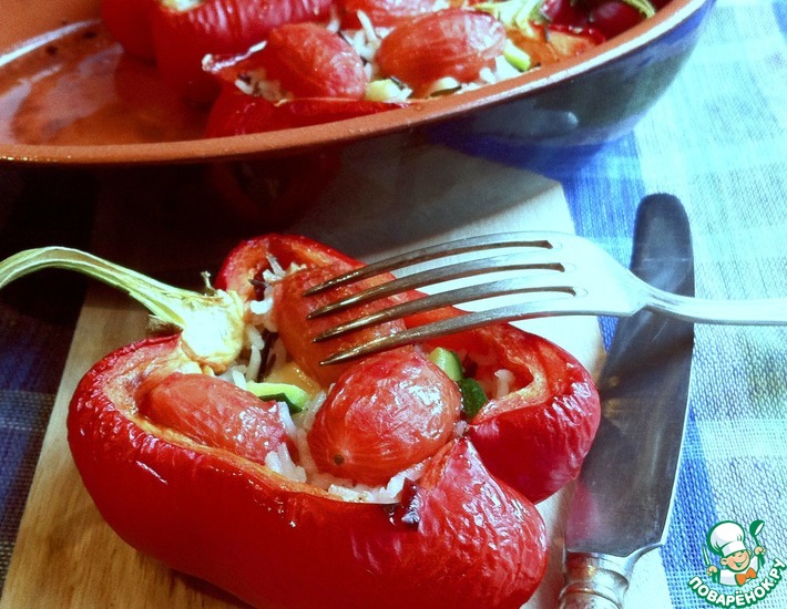 Достаем перцы и выкладываем в них рисовую смесь и помидоры черри. Слегка сбрызгиваем оливковым маслом и запекаем еще 15-20 минут. За это время перцы получаются не распаренными и остаются сочными.