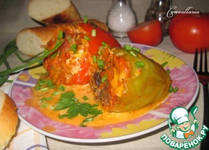Готовые перцы подавать, обильно полив соусом и посыпав мелко нарезанной зеленью.