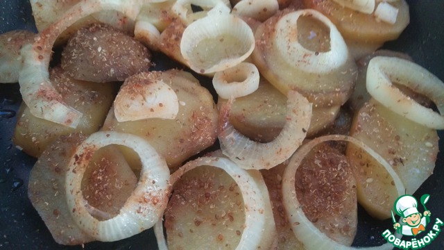 На картошку выкладываем лук, солим, перчим. Я еще люблю добавлять приправу "для картошки"