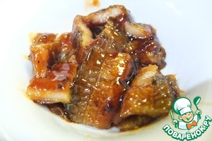 Сверху выкладываем кусочки угря и поливаем соусом.