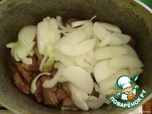пока резали лук мясо пустило сок. Сливаем его в какую-то емкость, делаем большой огонь и минут 10-15 жарим мясо до румянца. Помешивая и подливая слитый сок, что бы мясо не подгорало