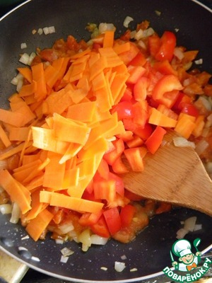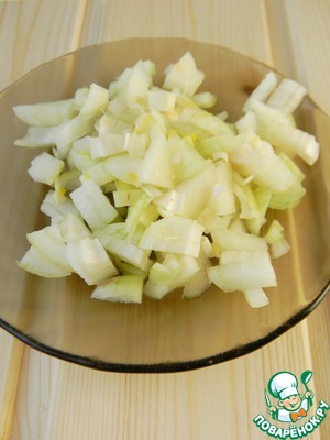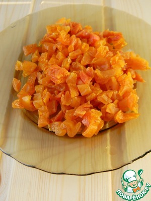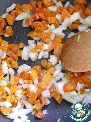 В сковороду положить масло, слегка поджарить лук и курагу.