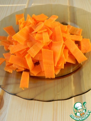 Морковь нарезать тонкими брусочками. Я использовала сначала терку, затем нож.