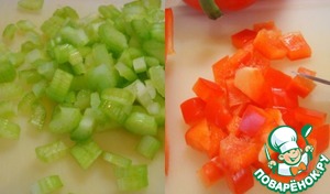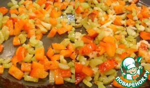 На оставшемся после обжарки колбасок масле обжарить мелко нарезанный лук, сельдерей и перец 7 минут. Как видите, у меня лука нет. Ну беда, не ест у меня муж лук. Но вам советую! Затем добавить измельченный чеснок и продолжать жарить буквально 30 секунд, чтобы пошел аромат.