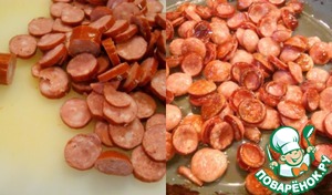 Колбаски нарезать тонкими кружочками и обжарить на растительном масле в течение 5-7 минут. Выложить из сковороды в тарелку. Кстати, сковороду берите достаточно глубокую.