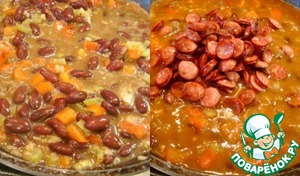 Теперь добавить фасоль вместе с соком из банки и все специи. В самом конце положите обжаренные колбаски, бульон и посолите. Довести до кипения и потушить на слабом огне 5 минут. Да, количество бульона я писать не стала, так как вы сами по своему вкусу регулируйте густоту блюда. Я очень люблю, когда рис буквально заливают подливой или соусом, поэтому и бульона я брала прилично.