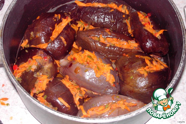 добавить 5 ст л соли, хмели-сунели и петрушку. Всё хорошо перемешать и заполнить прорези в баклажанах. Сложить в посуду, залить соусом, который остался от овощей, поставить на 2 дня под пресс в тёплое место. Готово. Теперь может храниться в холодильнике.