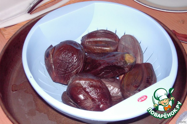 Делаем 2 у тонких баклажан, 4 у толстых баклажан прорези вдоль, варим 5-6 минут в сильно солёной воде и кладем в дуршлаг под пресс на ночь или несколько часов