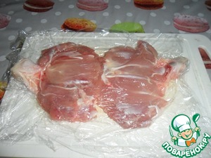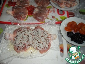 Выложить на пищевую пленку, посолить, слегка отбить между двумя слоями пленки.