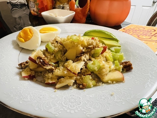 Добавить киноа. Все аккуратно перемешать. Грецкие орехи поджарить, измельчить, соединить с медом.