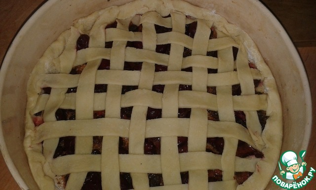 • Тесто разделить на 2/3 и 1/3. Большую часть раскатать и уложить в смазанную маслом форму, сделав бортик. Посыпать сухарями (можно манкой), полить вареньем, разложить вишню и изюм
