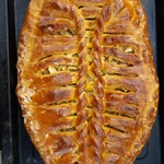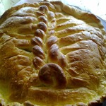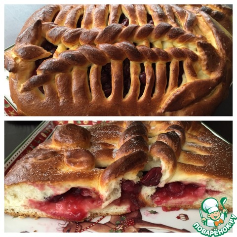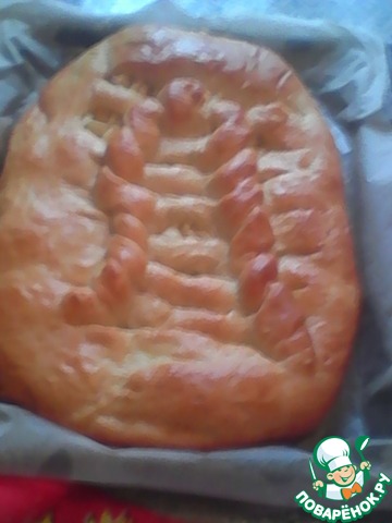 Теперь взбиваем желток и смазываем поверхность пирога. Противень застилаем бумагой для выпечки, перемещаем на него наш пирог и оставляем на 30 минут. Можно сформировать пирог прямо на противне.