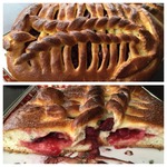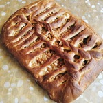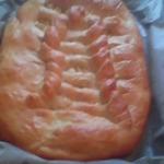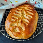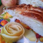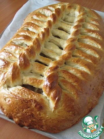 Давно хотела попробовать такое плетение из теста, оказалось совсем не сложно. Вспомнила вязание на спицах, метод примерно тот-же. Связала один рядок и осталась довольна. Начинка у меня самая любимая - яблочная... Не стала показывать как я готовила опару и замешивала тесто, уже неоднократно это делала, но описание прилагается.
