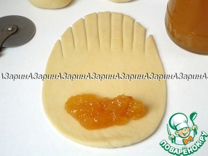 Из каждого шарика раскатать продолговатую лепешку. С одного края лепешки сделать, продольные надрезы на 1/3 её длины. На другой край лепешки положить по 1 ложке повидла.