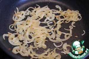 • Обжариваем лук на раскаленной сковороде в небольшом количестве оливкового масла до красивого румянца.