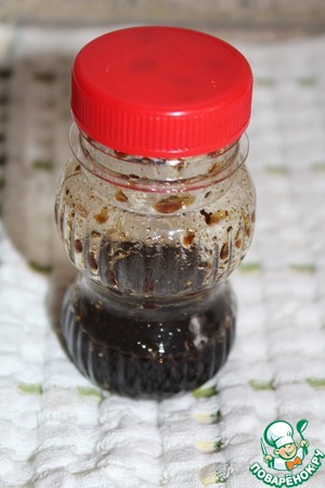 • В небольшой баночке смешиваем ингредиенты для заправки: оливковое масло, бальзамический уксус, соль, перец и сахар. Хорошо встряхиваем (предупреждаю, что соль и сахар полностью не растворяться).