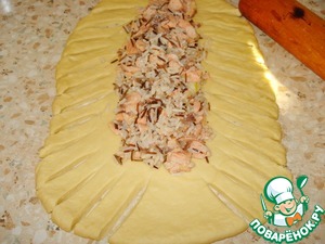 Тесто раскатываем в прямоугольник. Выложите начинку посередине. По бокам вырезать косые полоски.