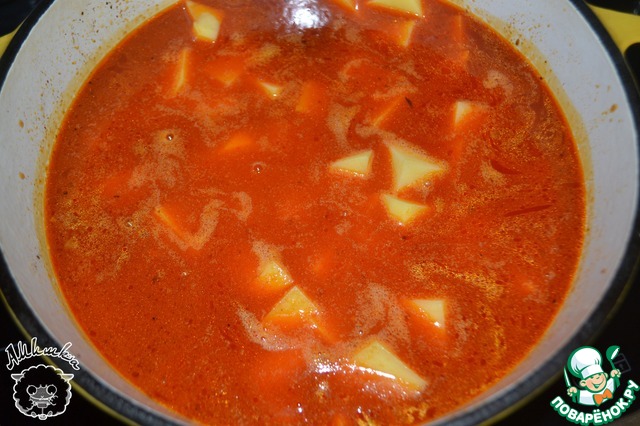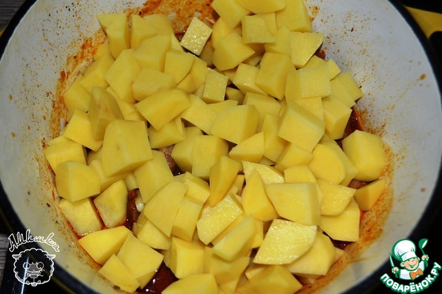 Доливаем воду, выравниваем на соль и специи и тушим все дальше до готовности картофеля.