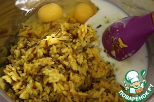 В миске смешать кефир, яйца и отварной рис.