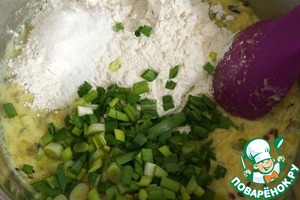 Добавить мелко нарезанный зеленый лук, муку, соль, разрыхлитель. Перемешать.