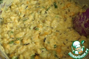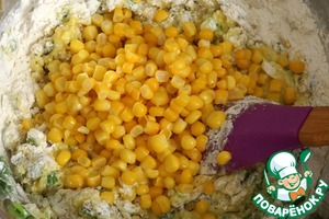 Добавить кукурузу и 1 ч. ложку ароматного масла (у меня кунжутное), еще хорошо все перемешать. Оставить тесто постоять минут 10.