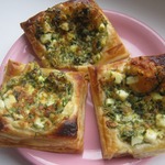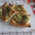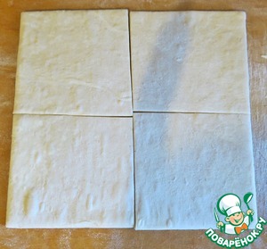 Подготовим тесто. Берем пластинку и делим ее на 4 равные части. Раскатывать не нужно. И сразу "квадратики" кладем на противень с пергаментом.