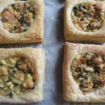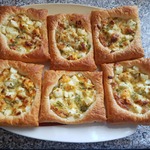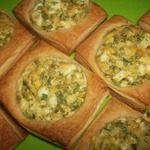 Сверху выкладываем начинку. И вот в таком виде отправляем в разогретую (!!) до 180 градусов духовку на 30-40 минут, до румяности теста. Я выпекала 30 минут, выключила духовку и дала им постоять еще немного внутри.