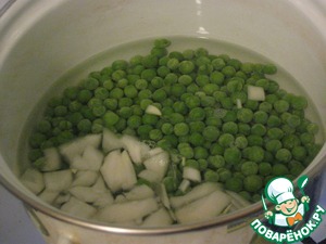 Замороженный горошек вместе с крупно порубленным луком залить горячей водой и варить под крышкой 8-10 минут.