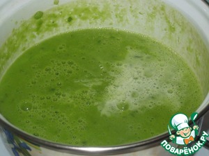 Горошек с луком и мятой измельчить блендером в пюре, влить сливки, прогреть на огне пару минут, не доводя до кипения. Посолить.
