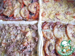 Это пицца-ассорти.. пицца-микс.. пицца на любой вкус.. На приготовление уходит чуть больше времени, чем на пиццу с одной начинкой, а угодить можно каждому домочадцу или гостю! Идею приготовления взяла у Джейми Оливера, который таким образом готовил римскую пиццу "Четыре вкуса".
