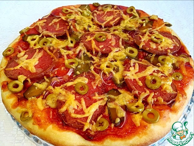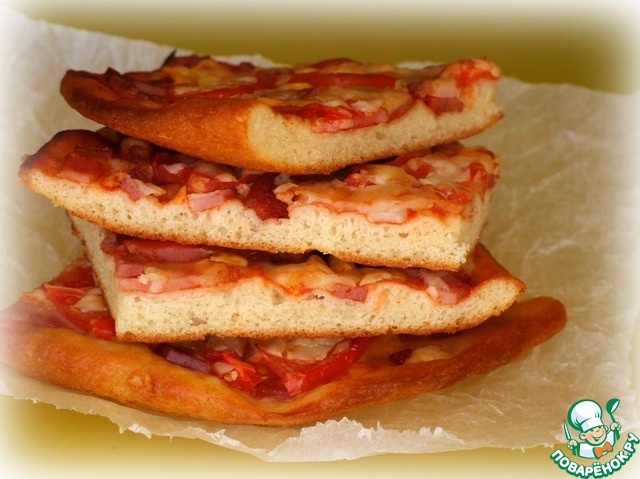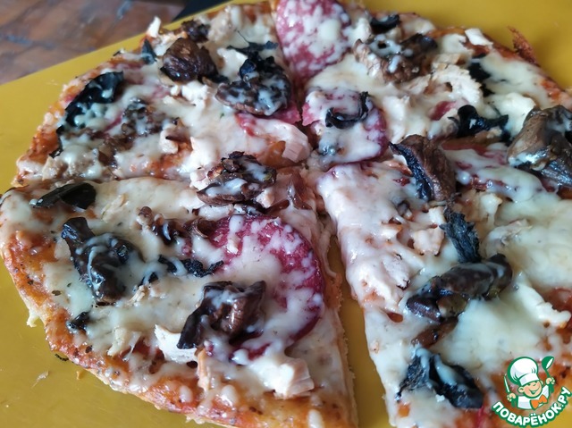 Подготовленную пиццу ставим в разогретую духовку и выпекаем около 10-ти минут или до готовности теста, не допуская пересыхания.