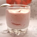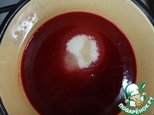 Вишневый сок смешать с сахаром и поставить на плиту. Варить до пробы "Мягкий шарик". ( Если каплю сиропа капнуть в холодную воду, то из нее можно слепить мягкий шарик). Если сок делаете сами, то нужно процедить его через сито, чтобы не попадались кусочки вишни в суфле, как у меня. (Я забыла это сделать). Если сок готовый, из пакета, то процеживать не нужно.