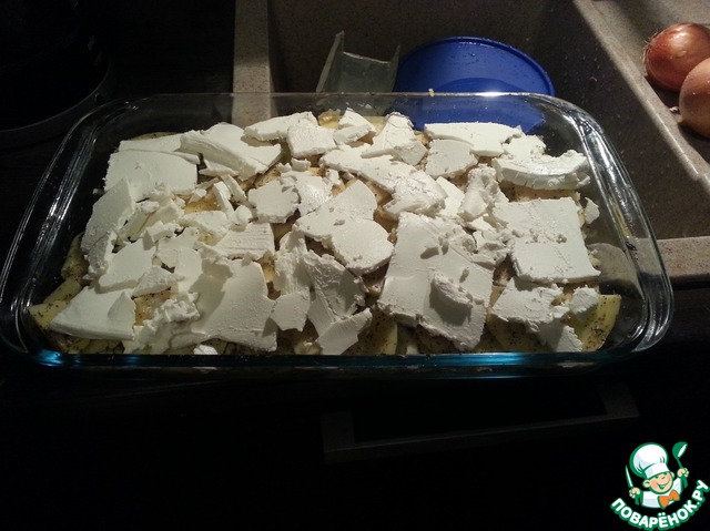 Повторяем шаг с резкой картофеля и выкладываем еще слой на сыр. Сверху опять сыр и специи.