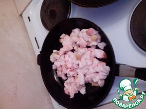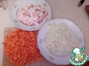 Добавляем к салу лук, а через время и морковку. Тушим пока морковка не станет мягкой.