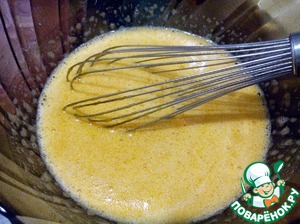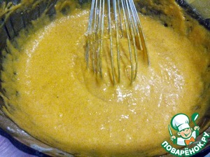 Яйца взбить с солью и сахаром в пышную светлую массу. Добавить тыквенное пюре, перемешать до однородности.