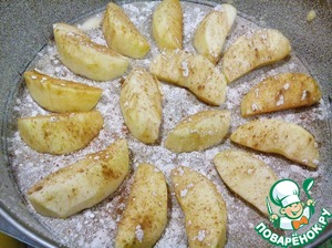 Форму для выпечки смазать сливочным маслом и присыпать манной крупой. Яблоки очистить и нарезать восьмушками, выложить их в форму и присыпать смесью корицы с сахарной пудрой.