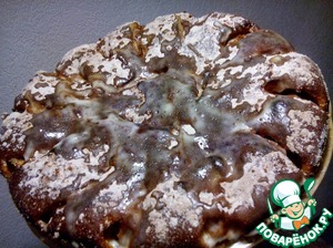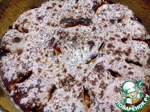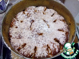 Вынуть готовый пирог из духовки (духовку переключить на режим гриль, да простят меня обладательницы обычных духовок) и щедро присыпав смесью сахарной пудры с корицей, вернуть пирог под гриль на 5–7 мин.