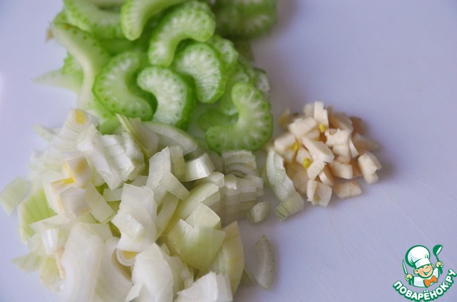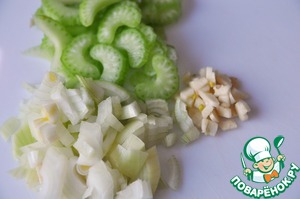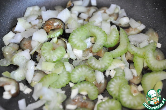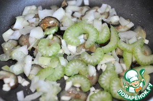 Добавляем нарезанные лук, чеснок и сельдерей и обжариваем ещё 5 минут.