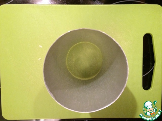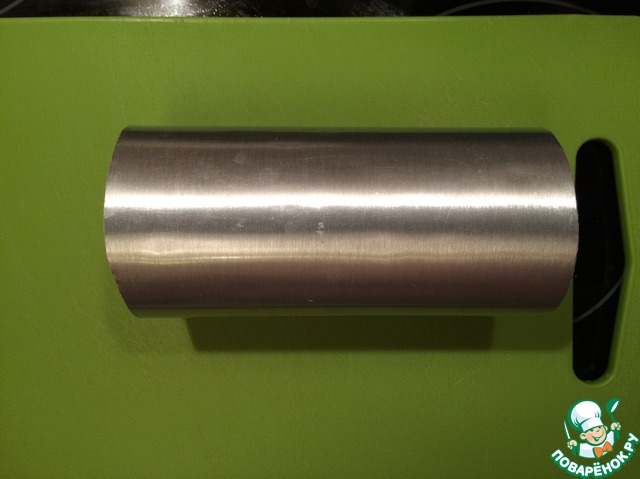 Тут необходима помощь второго кулинара, один удерживает тубус и тянет за веревку сетку, помогая надеть сетку на рулет, а второй опускает рулет в тубус. Получается вот такой рулет.