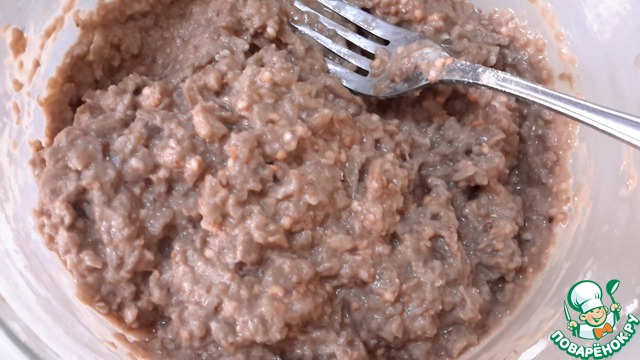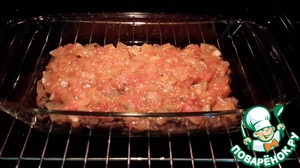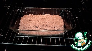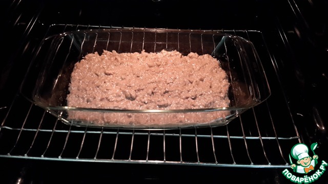 Стеклянную форму смазала 1 ч. л. масла растительного, только для защиты от прилипания. Выложила, разровняла, поставила в разогретую до 180 С духовку на 15 - 25 минут ( продолжительность зависит от духовки). Готовность вы увидите по образовавшейся корочке, именно корочке. Я к сожалению не сделала фото.