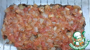 Кладем на наши баклажанчики наш домашний томатный соус и отправляем в духовку на 5 минут, просто для "соединения".