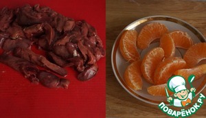 Пока варится рис, печень промыть и нарезать на брусочки. Мандарины разобрать на дольки.